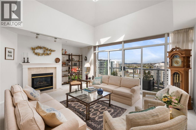 Perched atop the prestigious Regents Park, this stunning 17th-floor penthouse offers an exceptional blend of space, light, and breathtaking scenery in the heart of downtown Victoria. Spanning over 1,800 sq ft, this expansive residence is designed for both comfortable living and impressive entertaining. The main living and dining areas are filled with natural light, highlighted by soaring 9-foot ceilings and a dramatic vaulted skylight that enhances the open, airy feel. Floor-to-ceiling windows frame panoramic views of the city, mountains, and water, while a cozy fireplace anchors the inviting family room. The thoughtfully designed layout features two spacious bedrooms, a versatile den, and multiple outdoor spaces. With five private balconies, you can take in the views from nearly every angle, whether enjoying your morning coffee or unwinding at sunset. The primary suite is a true retreat, complete with a walk-in closet, additional storage, a private patio, and a luxurious ensuite with dual sinks, a deep soaker tub, and a separate walk-in shower. The second bedroom also offers a walk-in closet and its own private outdoor space, ideal for guests or family. The kitchen is both functional and stylish, featuring stainless steel appliances, quartz countertops, glass cabinetry, and a separate eating area with access to yet another balcony. A generous laundry room provides additional storage, while wide hallways and a well-appointed main bathroom with a tub and shower combination add to the home’s thoughtful design. This well-managed building offers secure underground parking, separate storage, and excellent amenities including a fitness facility and spa. A rare opportunity to own a bright, spacious penthouse with unmatched views in one of Victoria’s most sought-after communities. (id:39198)