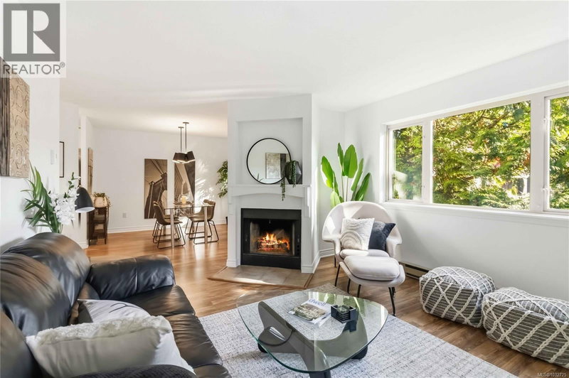 Welcome to this exceptional two-bedroom condo where space, light, and location come together beautifully. Offering over 1,000 sq ft of thoughtfully designed living space on the quiet southwest corner, this suite enjoys peaceful outlooks and privacy. Expansive windows fill the living and dining area with natural light, while a charming wood-burning fireplace adds warmth and character. Sliding doors open to a large private balcony, perfect for morning coffee, evening unwinding, or hosting friends. The spacious kitchen connects effortlessly to the dining area, creating a functional and inviting layout for everyday living and entertaining. The oversized primary bedroom is a true retreat with a walk-through closet, bonus vanity sink, and convenient direct access to the main bathroom. A well-sized second bedroom offers flexibility for guests or a home office. The suite includes in-suite laundry with extra storage space. Lord Harrison is a professionally managed, well-maintained, pet-friendly building offering secure underground parking, a storage locker, bike storage, and guest accommodations. All of this is just minutes from Fernwood Village, Downtown, and the Inner Harbour. Spacious, private, and perfectly positioned — this is condo living at its best. (id:39198)